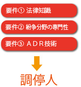 調停人の要件は、法律上「紛争の範囲に対応して、個々の民間紛争解決手続において和解の仲介を行うのにふさわしい者を手続実施者として選任すること」と規定されています(ADR 法第6条)。調停人になるには、一般的要件として①【法律知識】、②【紛争分野の専門性】、③【ADR技術】を全て満たしていることが求められます。