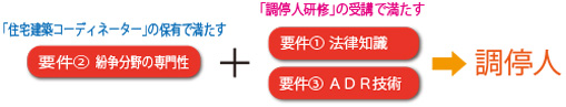 「住宅建築コーディネーター」資格の保有により、その専門分野については「要件② 紛争分野の専門性」を有するものとみなされますので、残りの「要件① 法律知識」「要件③ ADR 技術」を満たす調停人研修を受講することで、調停人となることができます。