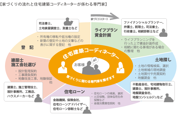 車や洋服とは異なり、一生をかけて支払っていくような高価な買い物である家づくりにも関わらず、内容をよくわからないまま安易に購入するのは非常にもったいないことです。その人にとって、本当に良い住まいを取得するためには、その人が住まいに何を求め、その要望を叶えるためにはどんな家づくりの方法が良いかを、お客様自身が判断できるようにする必要があります。そこで生まれたのが、“中立な住まい相談員”の「住宅建築コーディネーター」です。